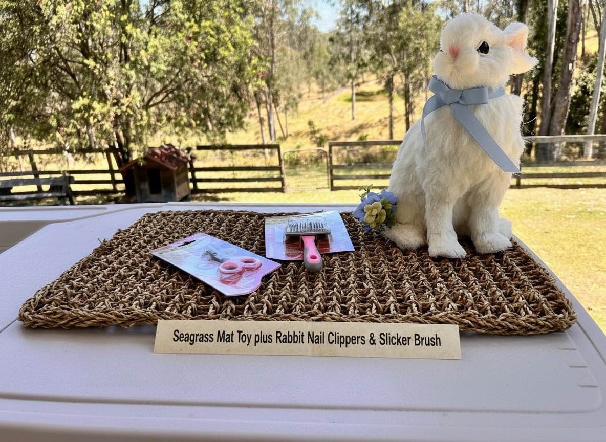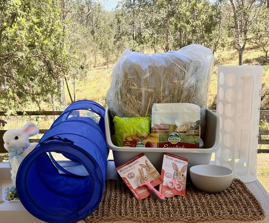 All the feeds and grooming gear for your new bunny plus a play tunnel and hay rack.